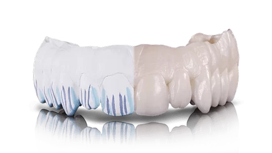 The Prettau Zirconia Bridge is designed and manufactured in our in-House Laboratory using CAD/CAM Technology (Computer-Aided Design / Computer-Aided Milling), ensuring a precise fit. The advantage of this restoration is that Zirconia is very durable, so there are no worries about the bridge chipping or cracking on you. The Bridge sits on your gum line and has no palate.
